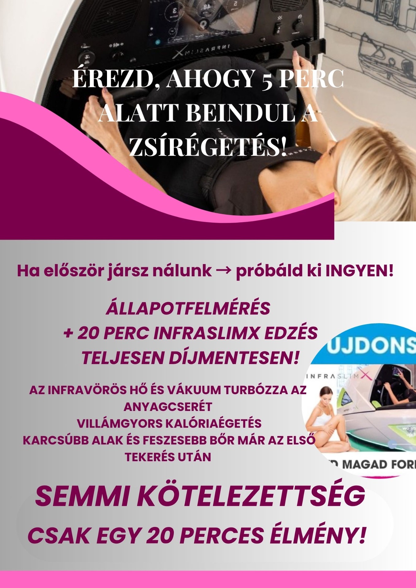 Az InfraslimX azoknak szól, akik szeretnének fogyni, formálódni, csökkenteni a cellulitot, beindítani az anyagcserét, vagy egyszerűen csak kikapcsolódni egy fárasztó nap után. Ha nincs időd órákat edzeni, de mégis látványos változást szeretnél, ez a megoldás neked való.