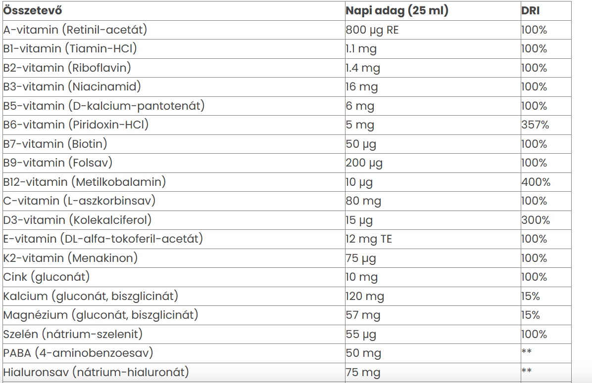 - Adagolás: napi 1 × 25 ml (20 adag / palack)