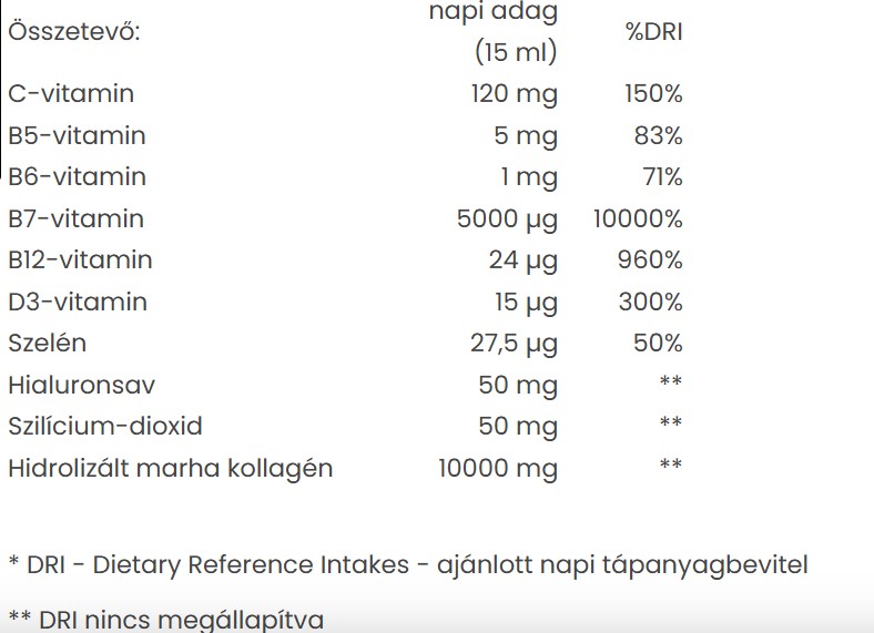 - C-, B5-, B6-, B7 és B-12 vitaminnal, valamint szelénnel, szilikával és hialuronsavval van dúsítva.